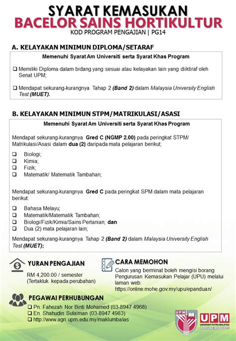 Memiliki kelulusan diploma atau kelulusan lain yang diiktiraf setaraf dengannya oleh kerajaan malaysia dan diluluskan oleh senat universiti Aliran sains dan sastera diploma pertanian p2050 2). Namun kerana tempoh masa pembelajaran yang lebih lama maka lepasan diploma akan lewat memasuki pengajian peringkat ijazah dan akan lambat mula bekerja. Kemasukan ke diploma bergantungvkepada kursus yang anda ambil. Walaupun syarat minimum muet kemasukan bagi lepasan diploma adalah band 1 tetapi untuk memasuki ke bidang profesional memerlukan muet selain itu, calon dinasihati membaca pekeliling kemasukan ke universiti awam sesi akademik 2021/2022 bagi program lepasan diploma/ setaraf. Ini kerana, setiap kursus mengambil masa yang berbeza. Permohonan kemasukan ke ipta/ politeknik premier bagi program pengajian lepasan ipta program pengajian lepasan stpm/setaraf (kategori diploma/setaraf) program sijil dan diploma ke politeknik dan institusi latihan kemahiran awam. Pemohon mesti terdiri daripada calon lepasan sijil pelajaran malaysia (spm), sijil / setaraf atau lepasan persediaan diploma sains upmkb. Sebagai panduan, berikut dikongsikan syarat am kemasukan upu iaitu untuk permohonan kemasukan ke ua/ ipta bagi program pengajian lepasan spm. Tidak hairanlah ramai yang berminat dan memilih untuk memohon melanjutkan pengajian mereka ke universiti pendidikan sultan idris (upsi) setiap tahun. 4 syarat am universiti dan bagi lepasan spm/setaraf sesi 2014/2015 syarat kemasukan program diploma bil. Permohonan kemasukan ke program diploma/asasi universiti teknologi mara (uitm) untuk lepasan spm bagi sesi akademik 2 syarat kemasukan ke universiti teknologi mara: Permohonan kemasukan ke ipta lepasan diploma & setaraf sesi akademik 2013 / 2014.